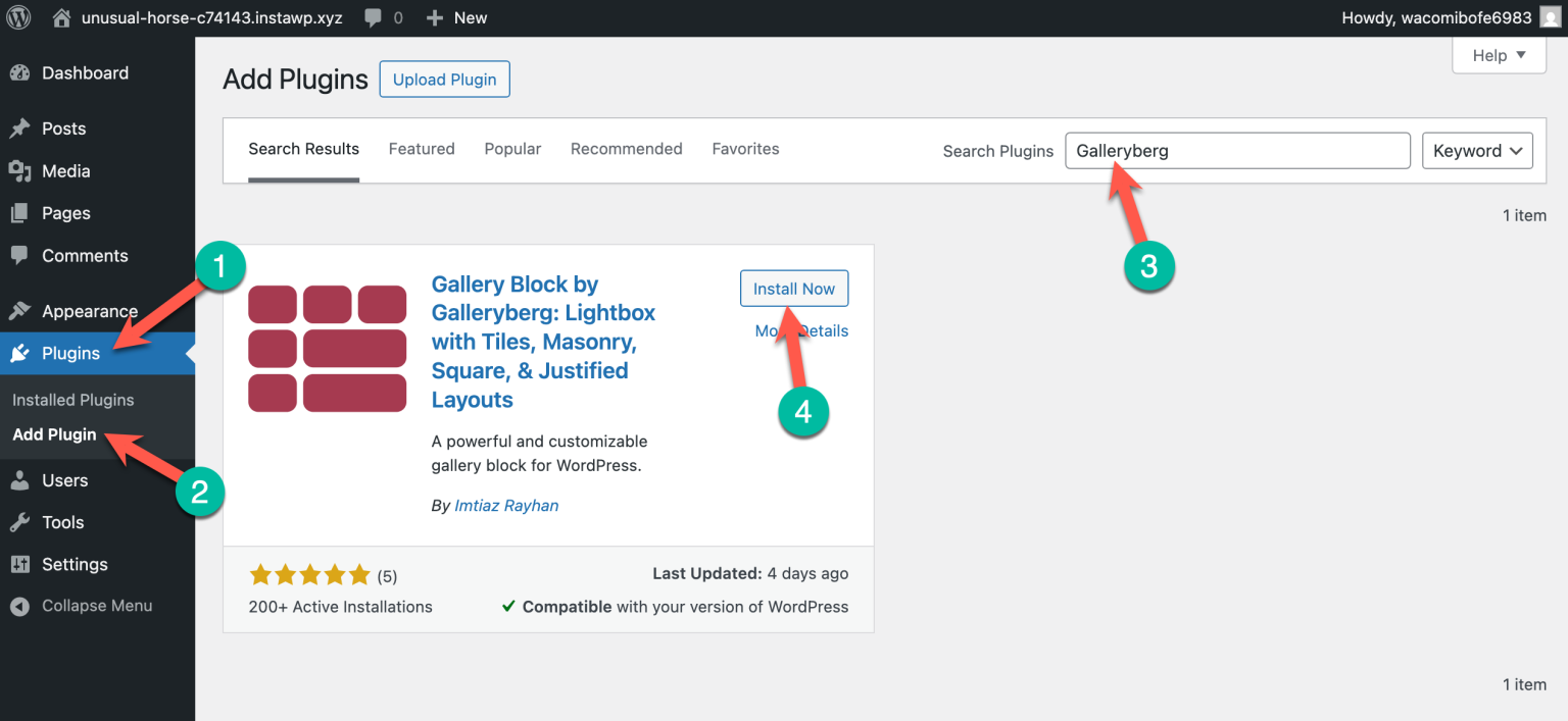 Go to your WordPress dashboard and navigate to Plugins → Add New. Search for Galleryberg, install the plugin, and activate it.