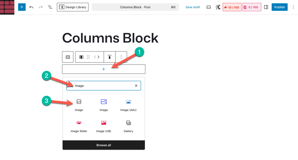 Open the post or page where you want to add your images. Click the plus (+) icon in the editor, search for Columns, and insert the block.